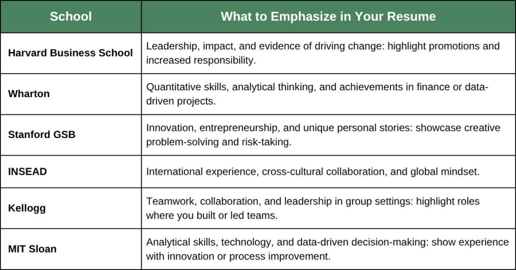 If a school is renowned for finance (e.g., Wharton), emphasize your quantitative, budgeting, or investment experience. For schools with a focus on entrepreneurship (e.g., Stanford GSB), showcase your innovation, startup work, or new initiatives you’ve led. If a program values global perspective (e.g., INSEAD), highlight international projects or cross-cultural teamwork.